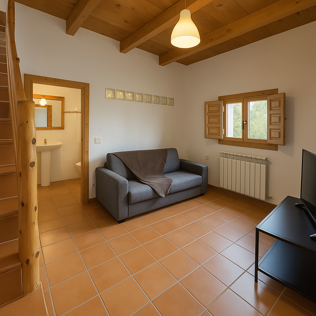 En la planta baja, encontrarás una acogedora zona de descanso con sofá/cama, mesita y espacio de almacenaje, ideal para relajarse o compartir un momento especial. Además, cuenta con un baño completo privado, equipado con todo lo necesario para tu comodidad.