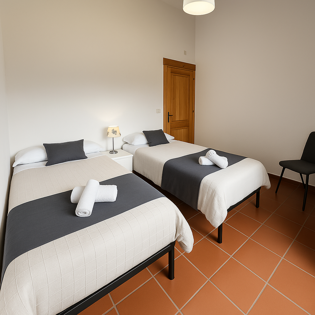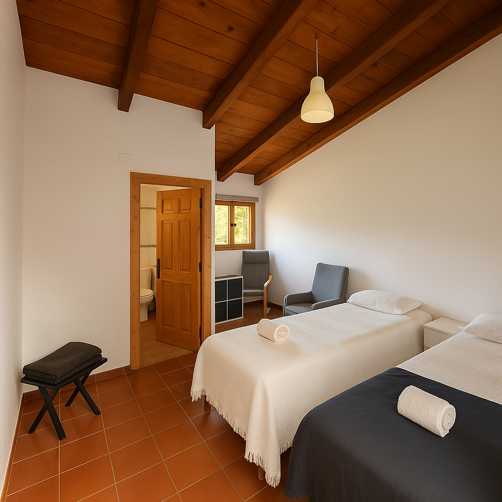 La habitación dispone de dos camas individuales con colchones de altas prestaciones, orientadas para ofrecerte una experiencia única: dormir con la mirada puesta en la naturaleza… y despertar con la luz suave del amanecer o incluso con las estrellas sobre ti.